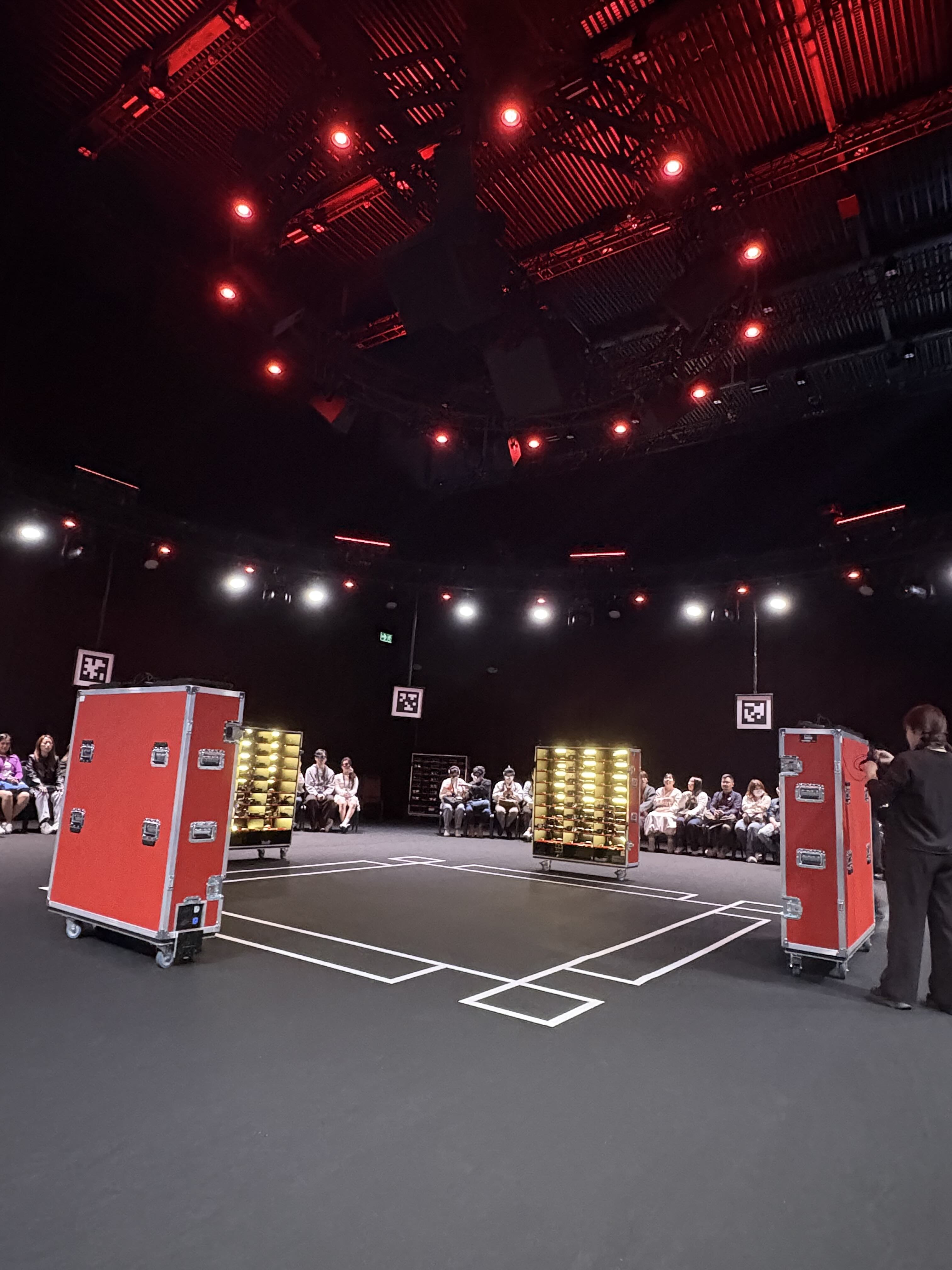 參觀結束後,我們被允許前往另一個區域。一排座位圍繞著中央舞臺展開,四周已經提前布置好了揚聲器與燈光設備,整個空間像是一個等待啟動的裝置。