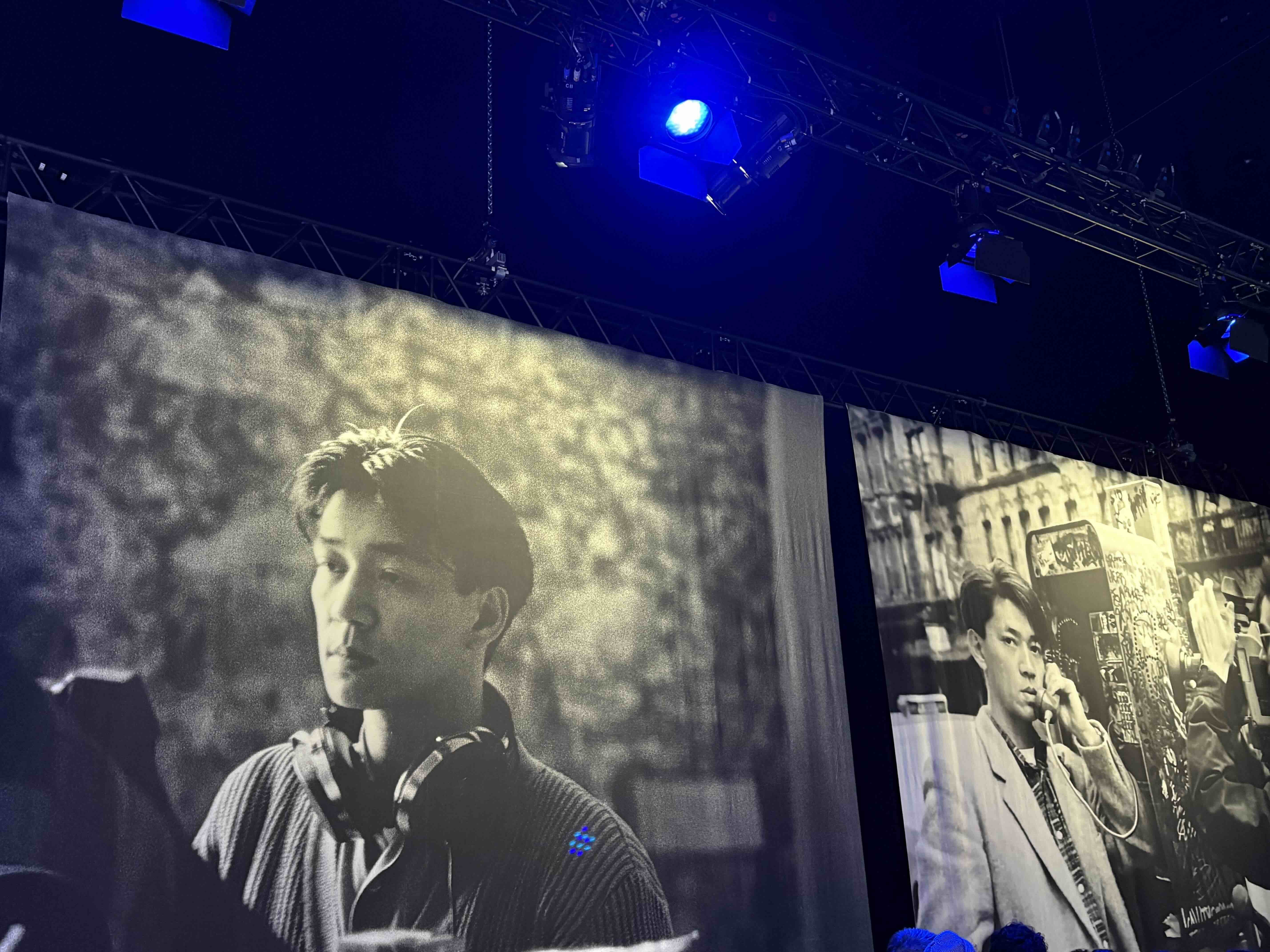 進入展廳後,首先映入眼簾的是兩側牆面上巨大的海報——不同時期的教授影像。有《東京旋律》裡意氣風發的帥氣小夥,也有奧斯卡金像獎時期站在創作巔峰的坂本龍一。