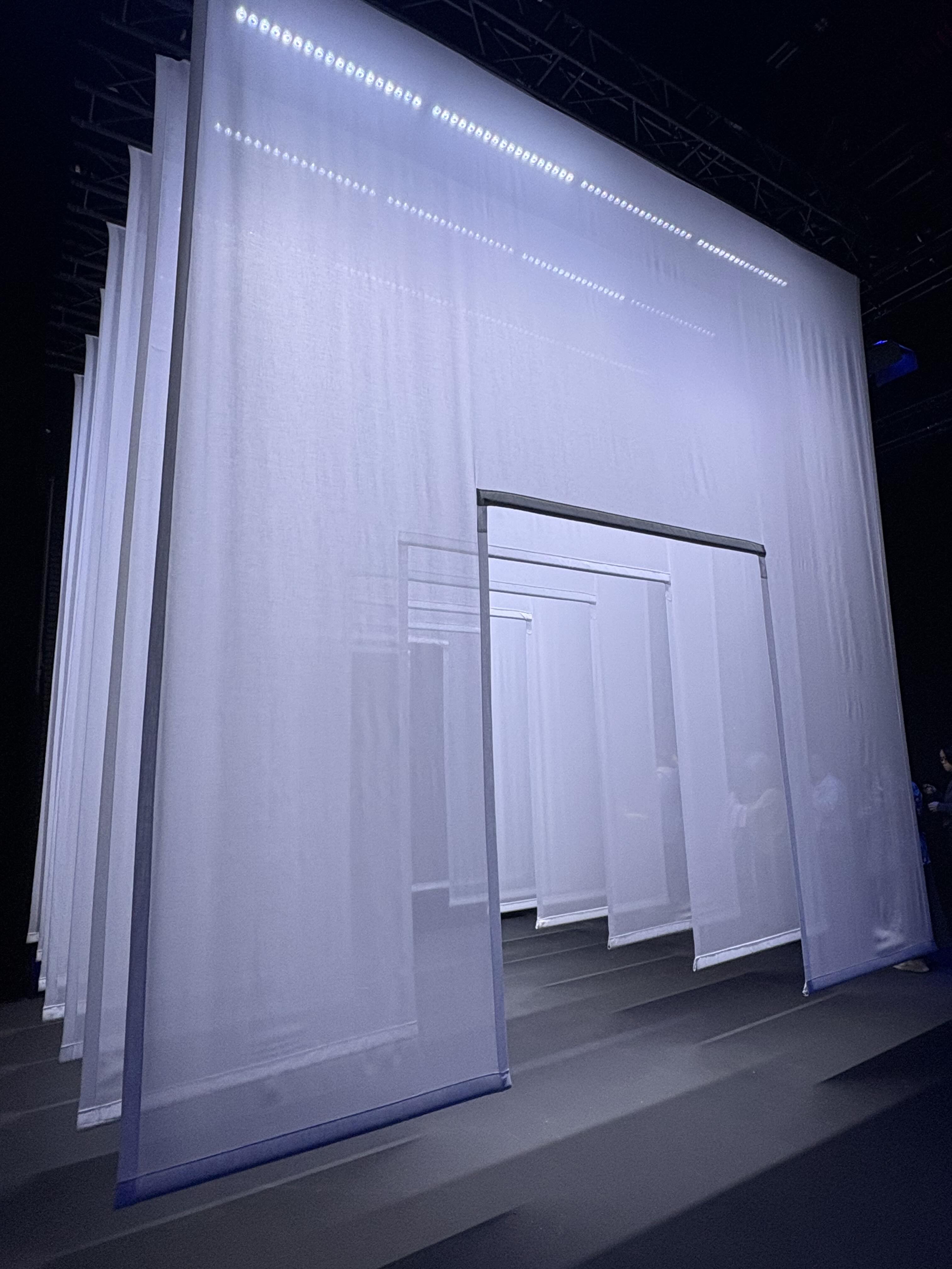 穿過過道後,眼前出現的是層層垂落的白色布幔,形狀像極了一座座白色鳥居。那一瞬間彷彿來到了京都伏見稻荷大社,只是少了木質的厚重,多了一份輕盈與飄逸。彷彿從此踏入了一個異世界。話說回來,鳥鳥居傳說是連接神明居住的神域與人類居住的俗世之通道,這個說法感覺多少有點沾邊。